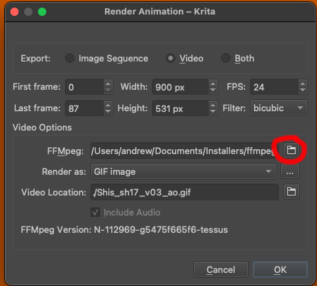 In order to export video and gifs from Krita, you’ll need to download ffmpeg.